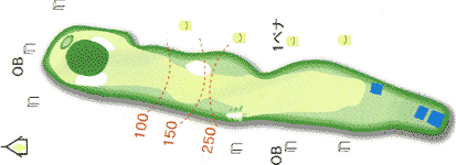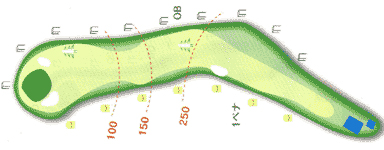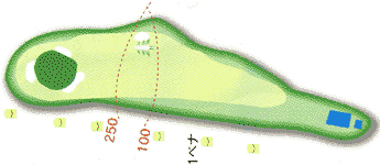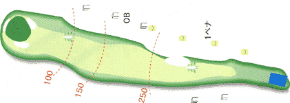 グリーンの左右のバンカーが花道を狭めている。 特に右のガードバンカーは絶対に入れてはだめ。![]() |