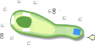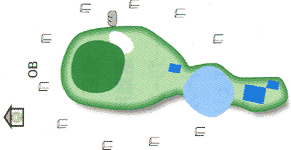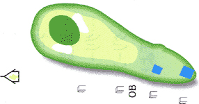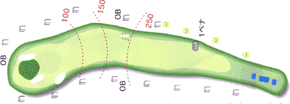右ドッグレッグのタフなロングホール。 右はセカンドショットからワンペナ。 グリーンは2段。 |