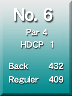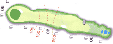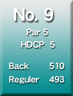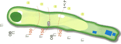 ゆるやかなダウンヒルのロングホール。 左右は谷でのOB。 正確なショットでバーディーを狙う。 |