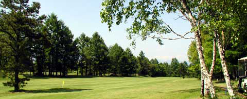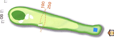 距離の短いミドルホール。 FW縦の木の右狙い。曲げると立ち木に阻まれ2オンが難しくなる。 |